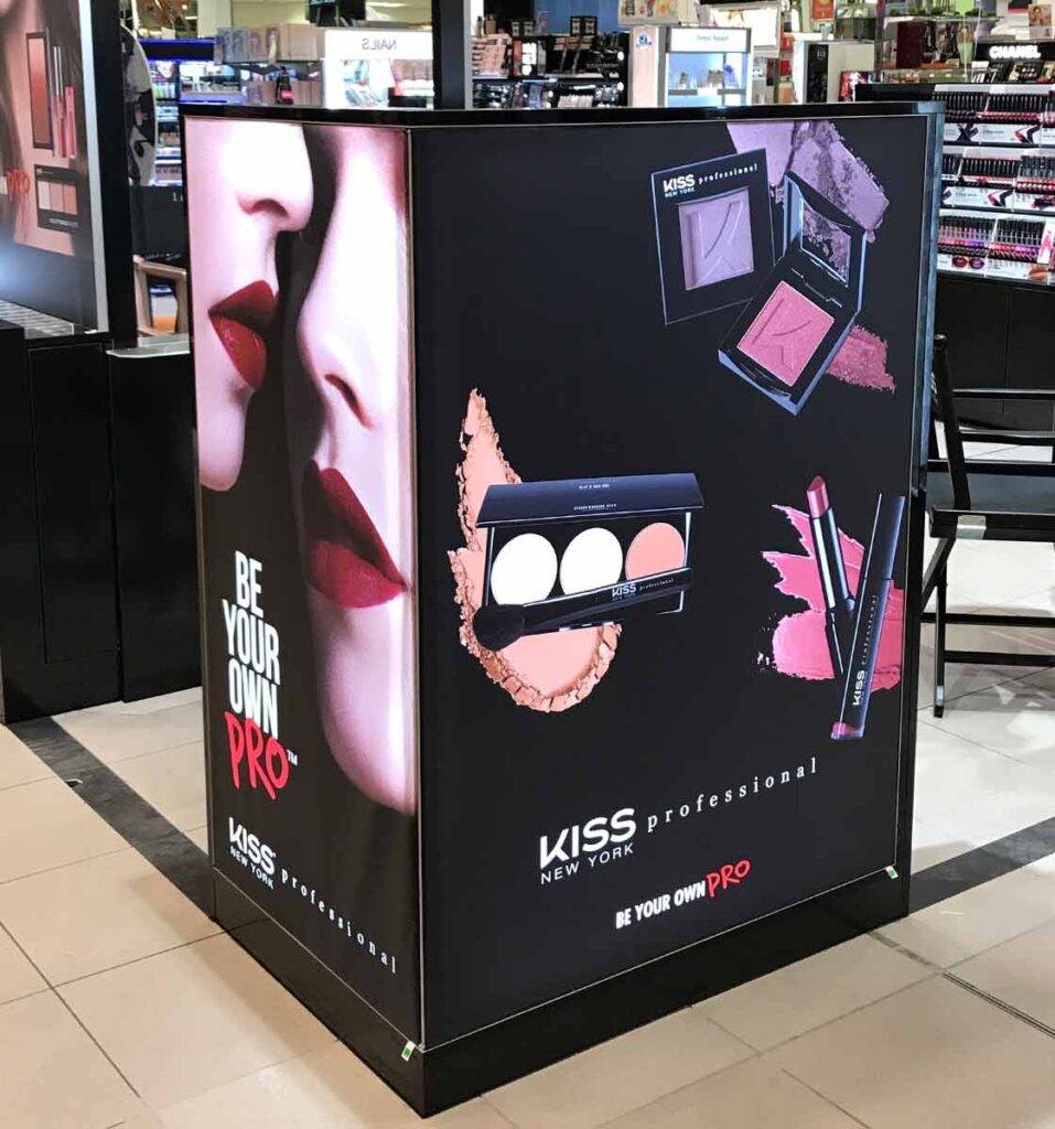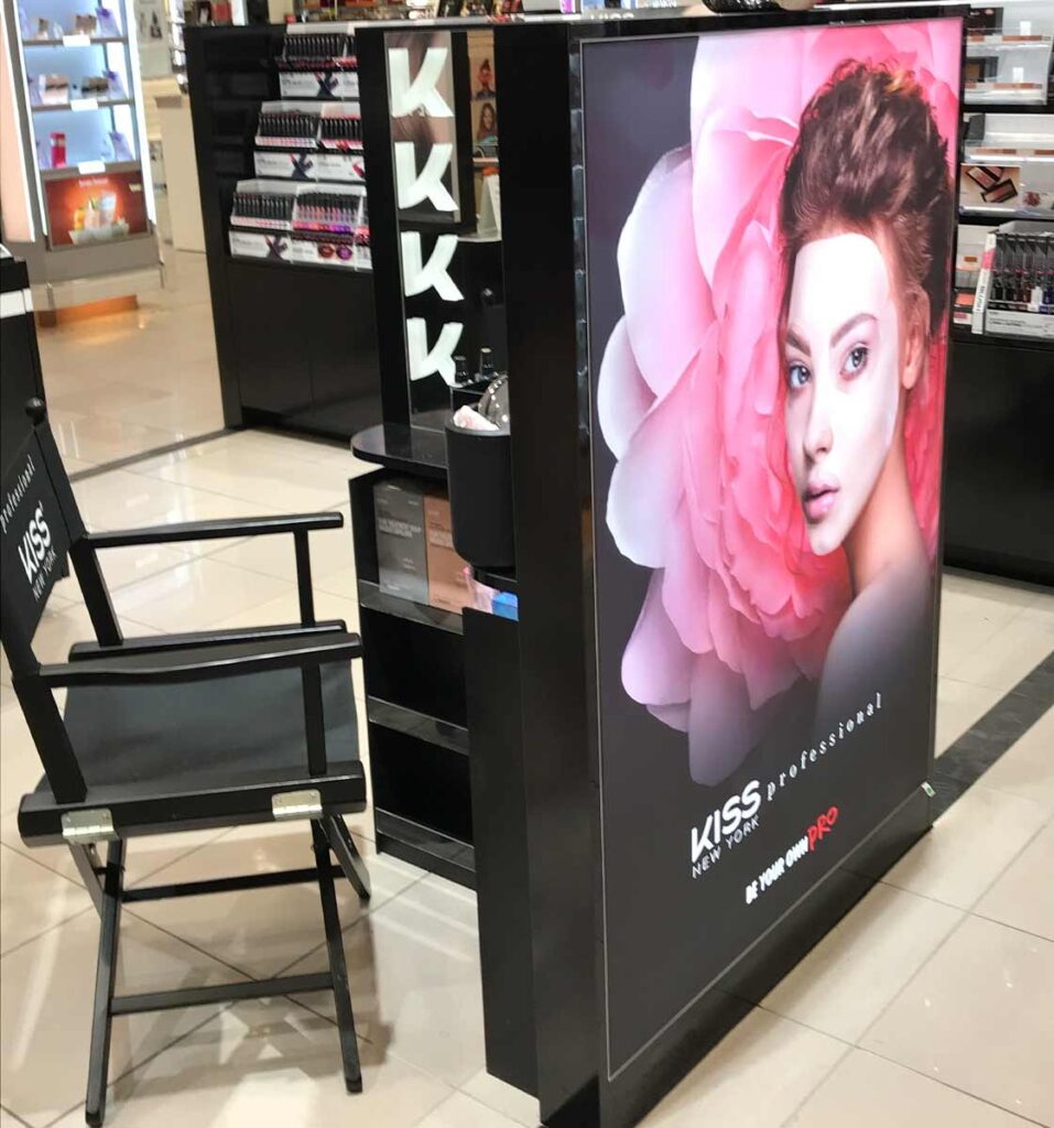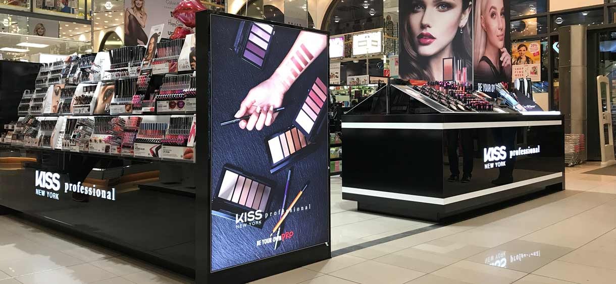 Unsere maßgeschneiderten Leuchtkasten-Displays setzen die einzigartigen Produkte von KISS perfekt in Szene. Durch die harmonische Integration von diversen Möbeln schaffen wir eine ansprechende Einkaufsatmosphäre, die die Kunden begeistert.